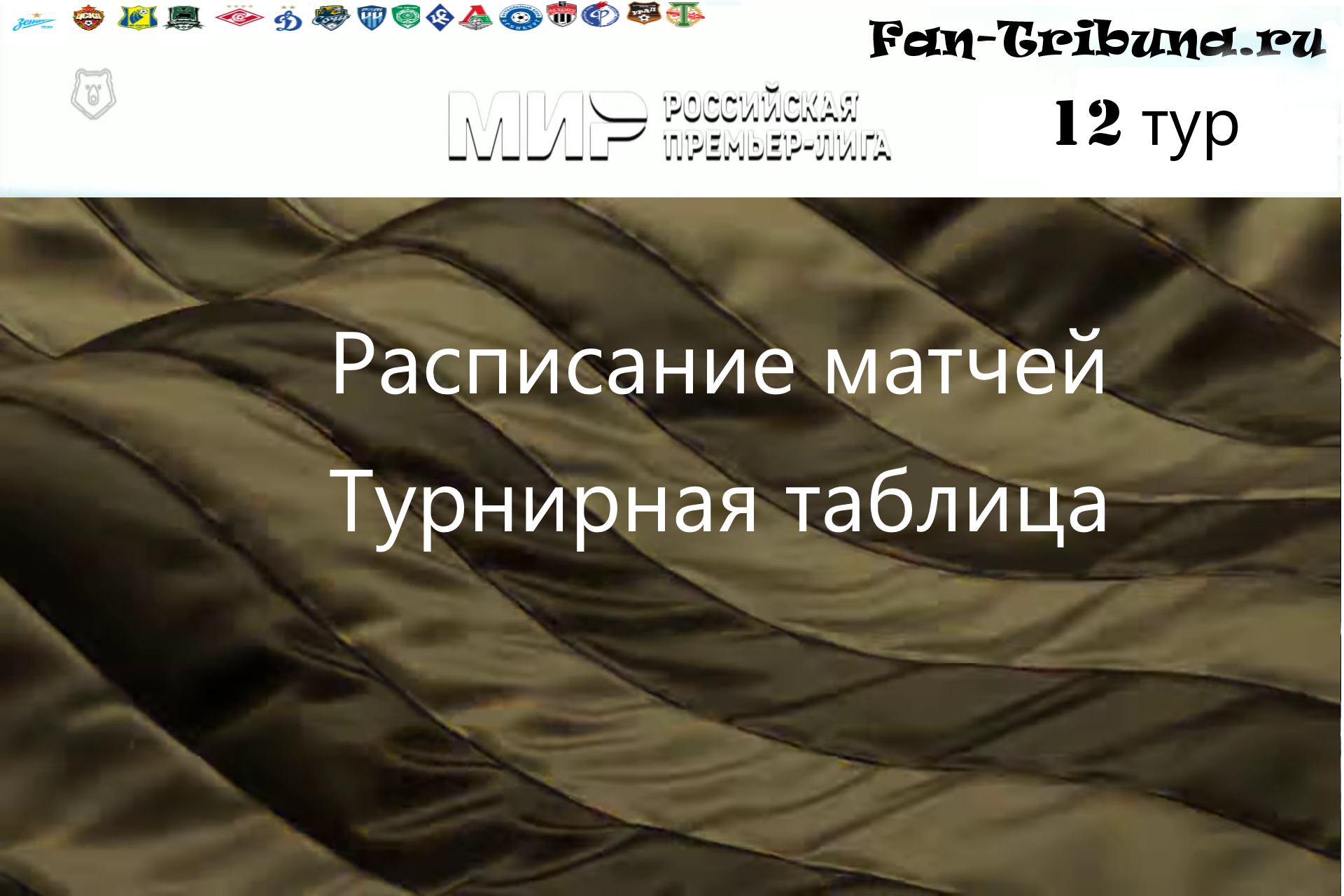 Привет всем фанатам футбола ! С расписанием матчей на 12 тур сезона 22/23 Российской Премьер Лиги вы ознакомитесь на этой странице сайта Fan-Tribuna.ru. А так же узнаете о расположении команд в турнирной таблице перед предстоящими поединками футбольного чемпионата . Прямые трансляции и видеообзоры игр 12 тура вас ждут на нашем сайте. Всем удачи и увлекательных просмотров.