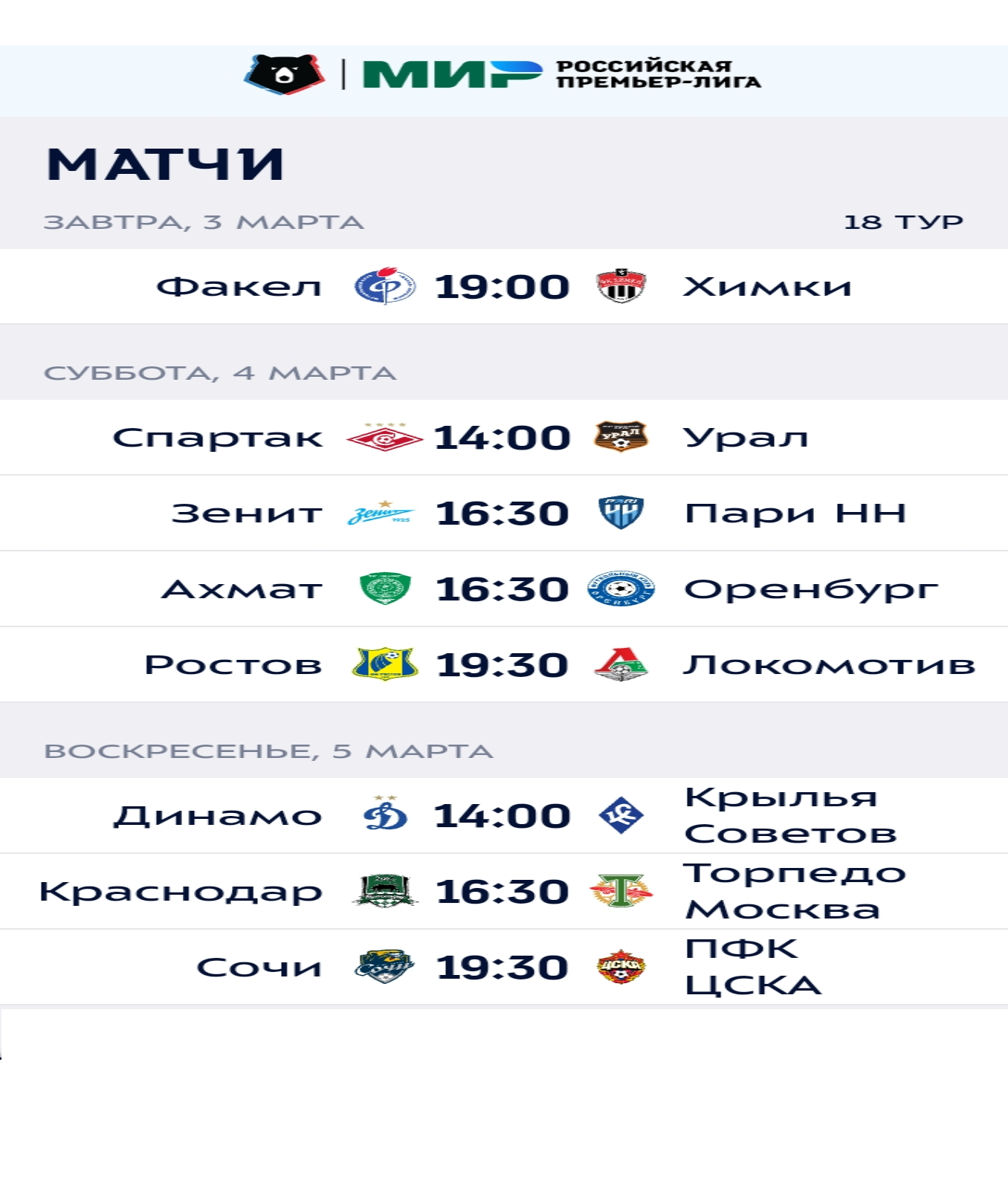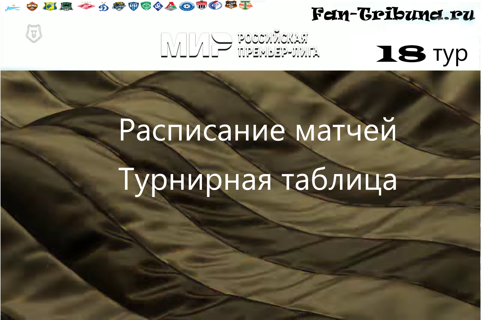 Привет всем любителям спорта и фанатам футбола ! С расписанием матчей на 18 тур сезона 22/23 Российской Премьер Лиги вы ознакомитесь на этой странице сайта Fan-Tribuna.ru. А так же узнаете о расположении команд в турнирной таблице перед предстоящими поединками футбольного чемпионата Российской Премьер Лиги. Прямые трансляции и видеообзоры игр 18 тура вас ждут на нашем сайте а так же на сайте Butsa.site. Всем удачи и увлекательных просмотров.