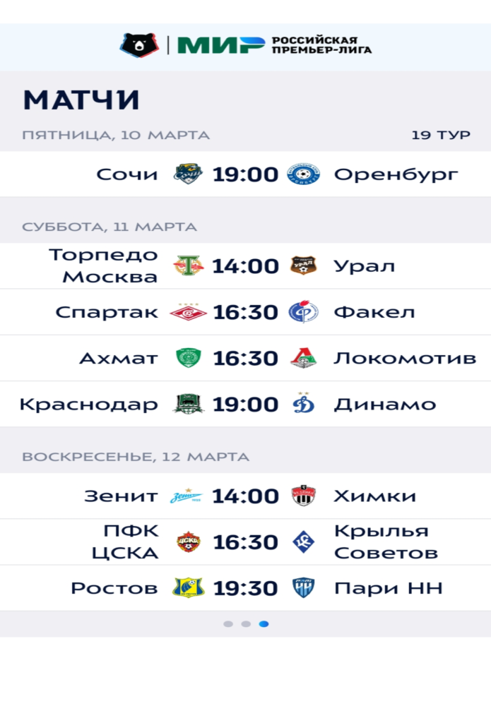 Привет всем любителям спорта и фанатам футбола ! С расписанием матчей на 19 тур сезона 22/23 Российской Премьер Лиги вы ознакомитесь на этой странице сайта Fan-Tribuna.ru. А так же узнаете о расположении команд в турнирной таблице перед предстоящими поединками футбольного чемпионата Российской Премьер Лиги. Прямые трансляции и видеообзоры игр 19 тура вас ждут на нашем сайте а так же на сайте Butsa.site. Всем удачи и увлекательных просмотров.